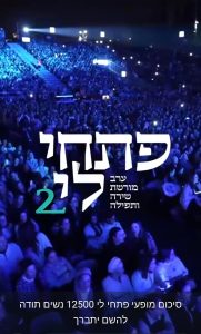 אירועי "פתחי לי" 2025 05/10/2025 אין תגובות לקראת יום הכיפורים יצא מופע פתחי לי 2 בטבריה, אשדוד ובריכת הסולטן בירושלים בהפקת Fdd Productions. סה"כ 12,500 נשים, שהתאחדו, שרו והתפללו לשובם קרא עוד »