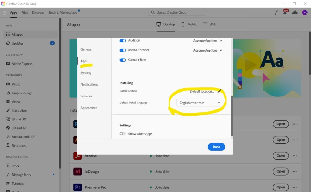 ולכן צריך להסיר את ההתקנה שלהן, ולשנות את ההגדרה בחלון הקריאטיב קלאוד> Apps> ל"english תומך עברית".