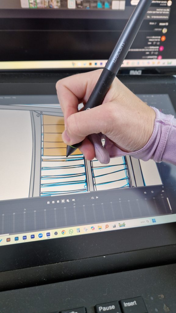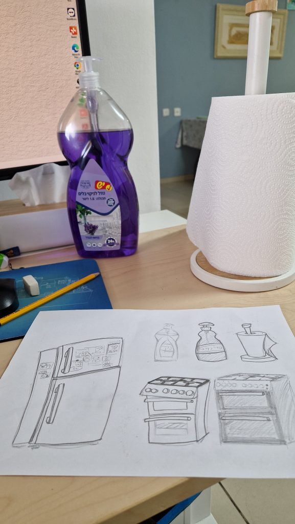 לפני שקיבלתי את המידות של המסכים, התחלתי לאייר את האלמנטים למטבח של סבתא אזולאי, במסך הראשון.